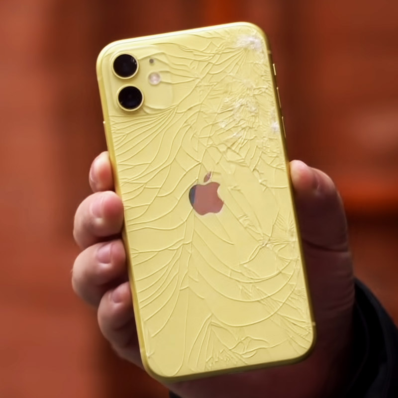 - Mặt kính sau iPhone 11 bị nứt vỡ do bị rơi va đập mạnh nhưng phải đảm bảo sườn máy không bị cong biến dạng.